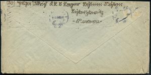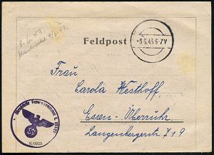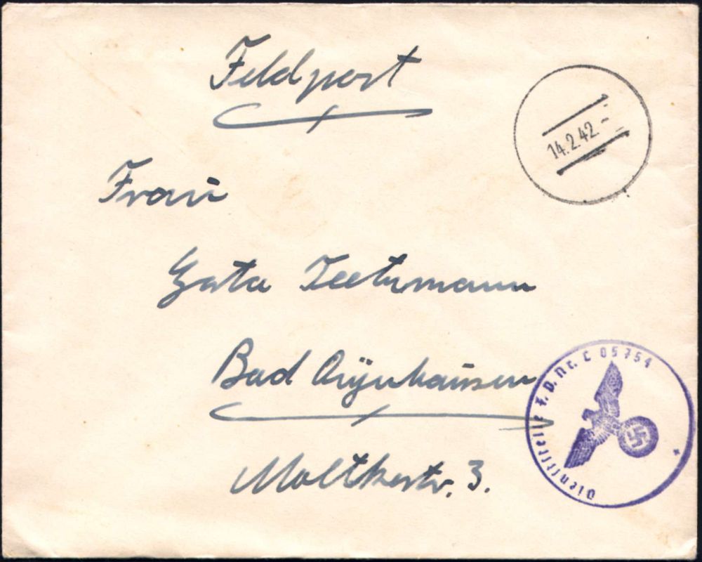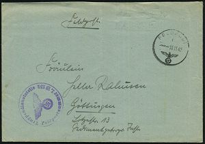 3022 | 18 € | LUFT- & BOMBENKRIEG / KINDER-EVAKUIERUNG (KLV) / FLAK-EINHEITEN (1939-45) : München 1942 (14.2.) stummer, aptierter HWSt = Tarnstempel München + viol. 1K-HdN: F.P. Nr. L 05754 = Ergänzungs-Gruppe N a c h t j a g d - Geschwader 1 + rs. hs. Abs., klar gest. Feldpost-Bf. n. Bad Oeynhausen (Mi. Stempelform 02 / Bo.73 apt.) | ![]() | |