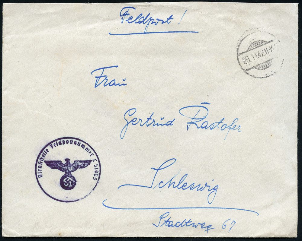 3040 | 16 € | LUFT- & BOMBENKRIEG / KINDER-EVAKUIERUNG (KLV) / FLAK-EINHEITEN (1939-45) : DEUTSCHES REICH 1942 (29.11.) stumme 1K-Brücke = Tarnstempel + blauer 1K-HdN: Fp.Nr. L 51903 = Nachtjagd-Geschwader 4 + rs. hs. Abs. (LGPA Münster) Feldpost-Bf. + Inhalt n. Schleswig | ![]() | |
