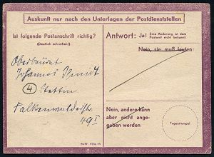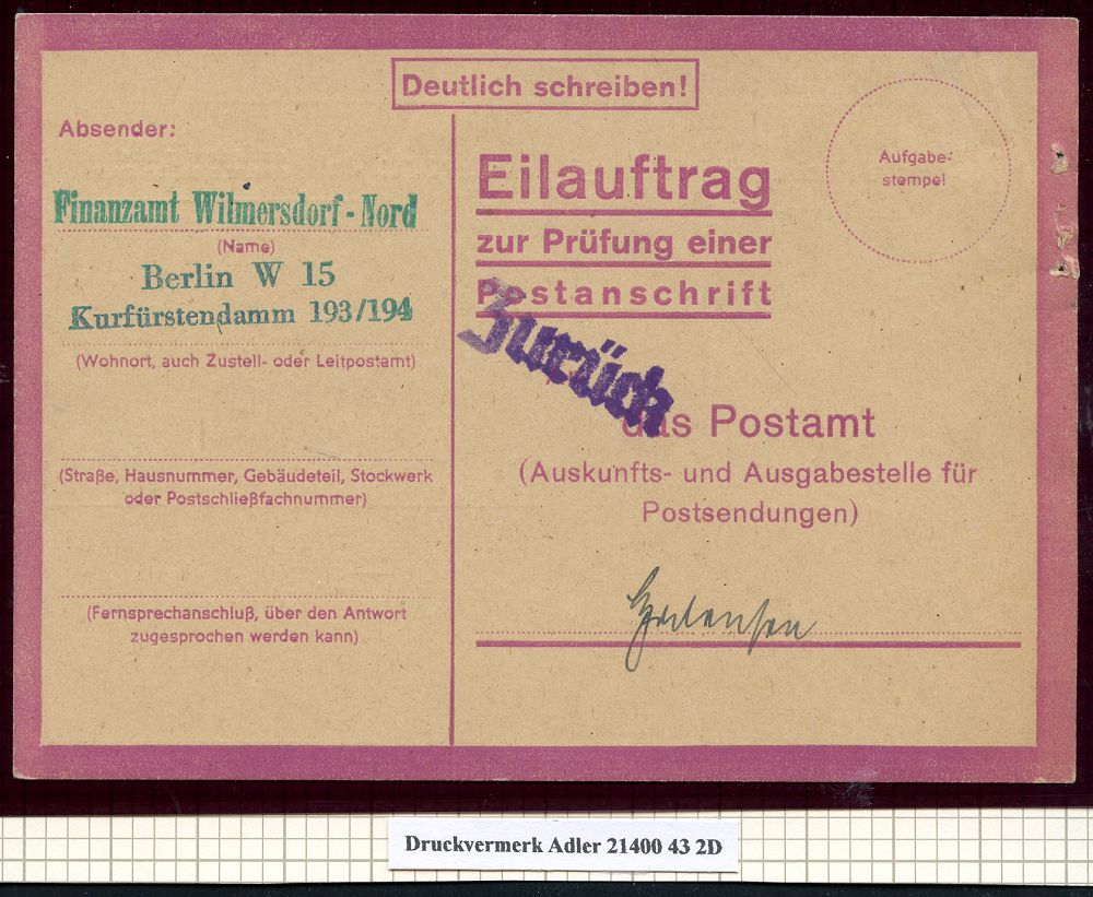 3008 | 30 € | LUFT- & BOMBENKRIEG / KINDER-EVAKUIERUNG (KLV) / FLAK-EINHEITEN (1939-45) : Berlin W 15 1944 (22.6.) viol. Eilauftrag zur Prüfung einer Postanschrift mit Druckvermerk 21400 43 2D (ME.Nr.2) + 1L: Zurück (rechts kl. Randklammerspur) seltene Eil-Retour-Karte n. Halensee | ![]() ![]() | |