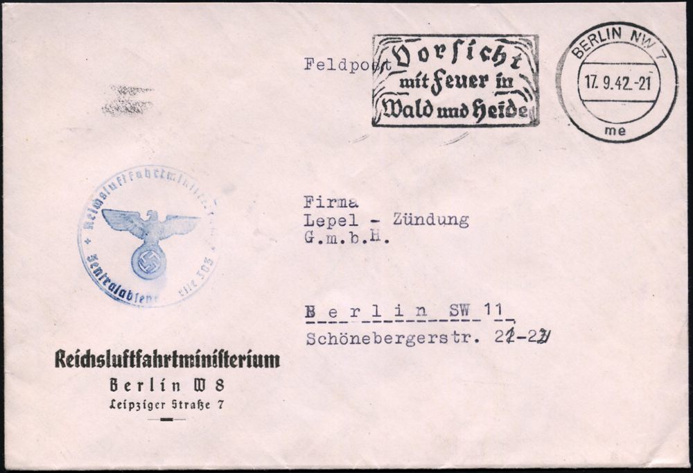 3006 | 25 € | LUFT- & BOMBENKRIEG / KINDER-EVAKUIERUNG (KLV) / FLAK-EINHEITEN (1939-45) : Berlin W 8 1942 (17.9.) Dienst-Bf.: Reichsluftfahrtministerium.. (= Hermann Göring )+ bl. 1K-HdN: Reichsluftfahrtministerium/ Zentralabsendestelle 303 (NS-Adler) MaWSt. BERLIN NW 7 (Bo.S 166 A) Recycling-Fp.-Dienstbf. aus russischer Generalstabkarte gefertigt! (Mi.1/Mi.39) im Jahr 1942 begannen vermehrt alliierte Bomberverbände deutsche Städte u. Industrieanlagen bombardieren! (Bo.S 166 A) | ![]() | |