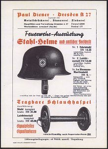3012 | 25 € | LUFT- & BOMBENKRIEG / KINDER-EVAKUIERUNG (KLV) / FLAK-EINHEITEN (1939-45) : Dresden A 27 1939 (ca.) Reklameblatt Fa. Paul Diener für Feuerwehr- u. Luftschutz-Ausrüstung mit Abb. eines Feuerwehr- u. Luftschutzhelms u. Schlauchhaspel (Forma A5) zweifarbig! | ![]() | |