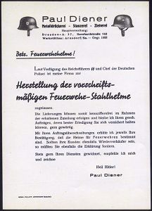 3011 | 20 € | LUFT- & BOMBENKRIEG / KINDER-EVAKUIERUNG (KLV) / FLAK-EINHEITEN (1939-45) : Dresden A 27 1939 (ca.) Reklameblatt der Fa. Paul Diener: "Betr. Feuerwehrhelme! Laut Verfügung des Reichsführers SS.." , Luftschutz- bzw. Feuerwehr-Stahlhelme, Format A5 | ![]() | |