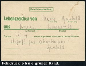 3010 | 35 € | LUFT- & BOMBENKRIEG / KINDER-EVAKUIERUNG (KLV) / FLAK-EINHEITEN (1939-45) : Bremen 1944 (7.10.) grüne Eil-Nachrichten-Kt. o h n e Druckvermerk und o h n e grünen Rand rs. = Fehldruck (ME.Nr,F 2) in guter Erhaltung an Feldpost-Nr. 21 542 (= Pio. Regts-Stab 627), seltener Beleg! | ![]() ![]() | |