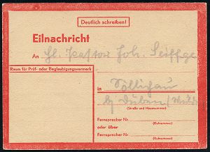 3019 | 30 € | LUFT- & BOMBENKRIEG / KINDER-EVAKUIERUNG (KLV) / FLAK-EINHEITEN (1939-45) : Halle/ S. 1945 (1.4.) rote Eil-Nachrichten-Kt. mit Druckdatum: StdW 4304 43 (ME.Nr.3) in sehr guter Erhaltung n. Söllinchau | ![]() ![]() | |