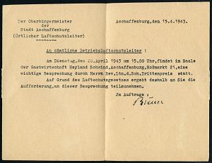 3004 | 20 € | LUFT- & BOMBENKRIEG / KINDER-EVAKUIERUNG (KLV) / FLAK-EINHEITEN (1939-45) : ASCHAFFENBURG 2/ Besucht/ Aschaffenburg/ die/ Spessartstadt 1944 (16.4.) AFS Francotyp "Reichsadler" = Schloß Johannisthal auf Dienst-Falt-Bf. mit Inhalt: "An sämtliche Betriebsluftschutzleiter!", betr. Besprechnung auf Grund des Luftschutzgesetzes (Dü.E-5CGo) | ![]() ![]() | |