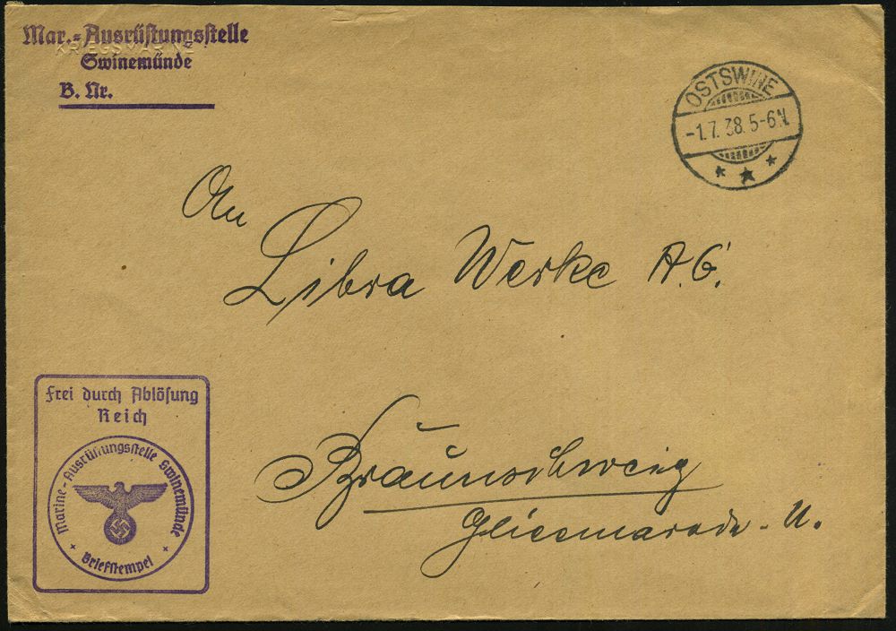 3054 | 15 € | DEUTSCHE KRIEGSMARINE 1933-1939 : OSTSWINE/ *** 1938 (1.7.) 1K-Gitter + viol. Ra.: Frei durch Ablösung/Reich/Marine-Ausrüststelle Swinemünde + viol. 3L , klar gest. Marine-Dienstbf. | ![]() | |