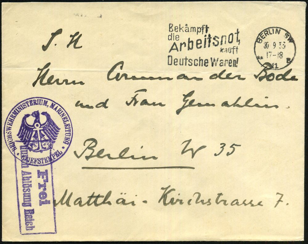 3049 | 16 € | DEUTSCHE KRIEGSMARINE 1933-1939 : BERLIN SW/ **11/ r/ Bekämpft/ die Arbeitsnot/ kauft/ Deutsche Waren 1933 (4.10.) Serien-MWSt + viol. 1K-HdN: REICHSWEHRMINISTERIUM MARINELEITUNG (noch Weimarer Adler + Anker) + viol. Ra.2: Frei/ durch Ablösung Reich (Bf. Querfalte) klar gest. Orts-Dienstbf. | ![]() | |