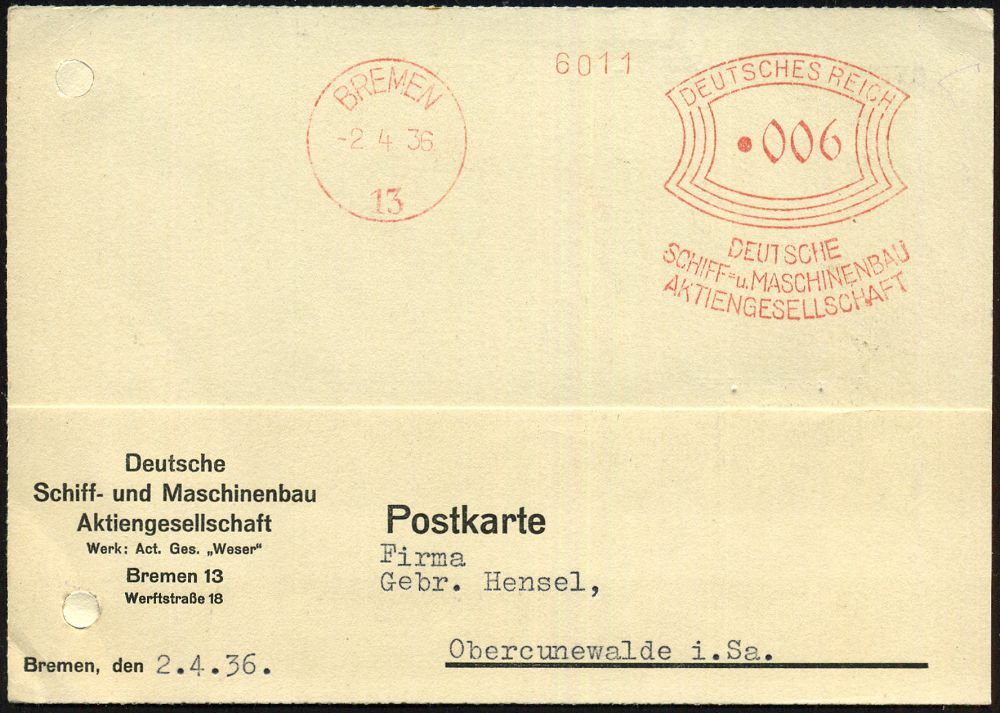 3050 | 18 € | DEUTSCHE KRIEGSMARINE 1933-1939 : BREMEN/ 13/ DEUTSCHE/ SCHIFF-u.MASCHINENBAU/ AG 1936 (2.4.) AFS Francotyp "Bogenrechteck" klar auf Firmen-Kt. (links Reg.-Lochung geschl.) Abs.: ..Werk: Act. Ges. "Weser" = Flugzeug- u. Kriegsschiffsbau, z.B. Zerstörer "Z 17" bis "Z 36", U-Boote "U 25-26", "U 64-65" u.v.a (Dü.E-1Ah) | ![]() | |