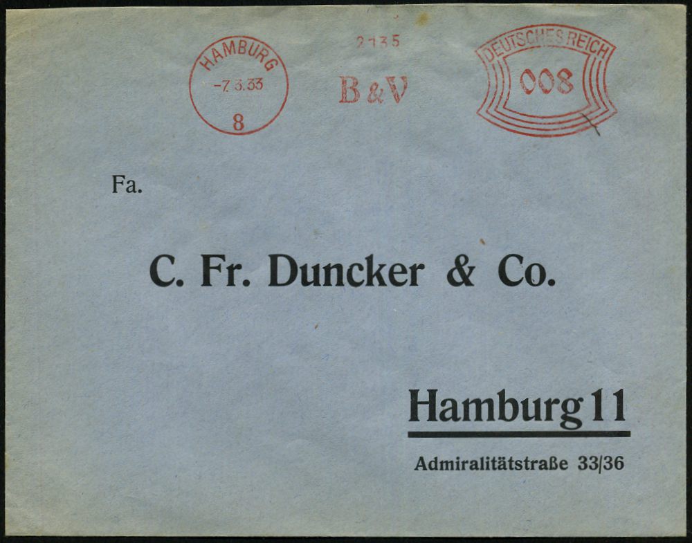3051 | 30 € | DEUTSCHE KRIEGSMARINE 1933-1939 : HAMBURG/ 8/ B & V 1933 (7.3.) AFS Francotyp "Bogenrechteck" = Blohm & Voss, gegr. 1877, vor dem II. Wk. Bau der "Adm. Hipper" u. Schlachtschiff "Bismarck", Segelschulschiffe der "Gorch Fock"-Klasse, im II. Wk. nur noch Bau von U-Booten etc. , rs. Abs.-Vordruck: BLOHM & VOSS/SCHIFFSWERFT U. MASCHINENFABRIK klar gest. Orts-Bf. (Dü.1BAh) | ![]() ![]() | |
