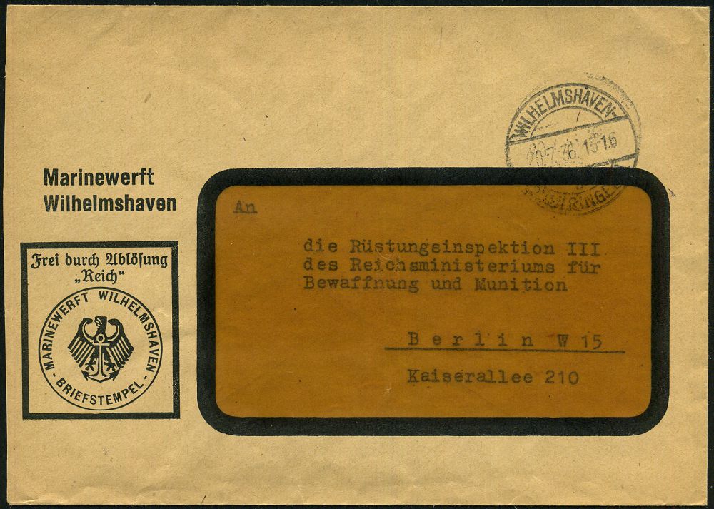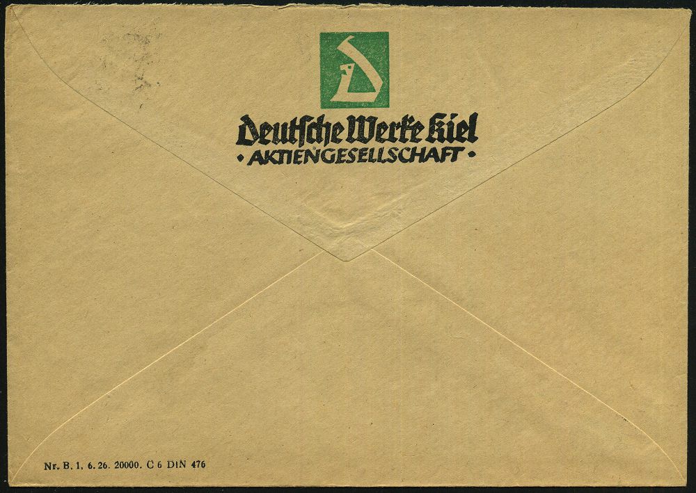 3052 | 30 € | DEUTSCHE KRIEGSMARINE 1933-1939 : KIEL/ 1/ D/ Deutsche Werke Kiel/ AG 1929 (7.5.) AFS Francotyp "Bogenrechteck" = ex Kaiserliche Werft, Kiel, vor und im I. Weltkrieg Bau von Kriegsschiffen u.a. Schlachtschiff "Gneisenau", Flugzeugträger "Graf Zeppelin" u.v.a. (Monogr.) rs. motivgl., zweifarbiger Abs.-Vordruck, Fernbf. + 2 Faksimile-Bilder (Dü.E-1Am) | ![]() ![]() ![]() ![]() | |