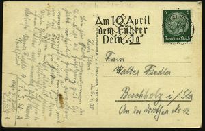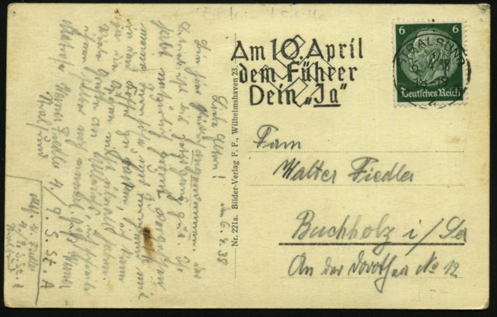 3055 | 16 € | DEUTSCHE KRIEGSMARINE 1933-1939 : STRALSUND/ *2d/ Am 10.April/ dem Führer/ Dein "Ja" 1938 (6.4.) seltener MWSt auf s/w.-Foto-Ak.: Die deutsche Kriegsmarine mit 14 Mikroskop-Ansichten von 14 Kriegsschiffen (kl. Eckmäng.) Bedarf (Bo.S274 A , nur 11 Tage verwendet) | ![]() ![]() | |