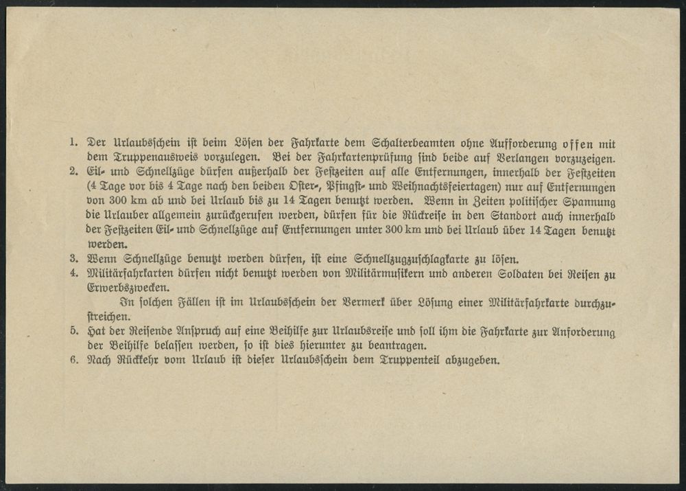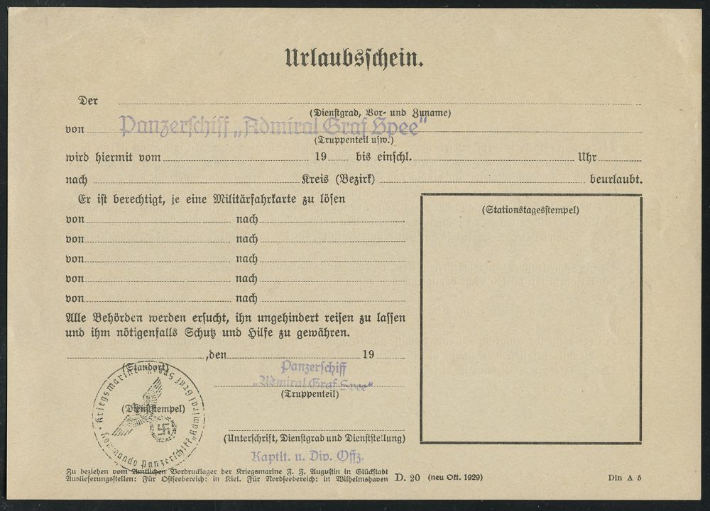 3059 | 25 € | DEUTSCHE KRIEGSMARINE 1933-1939 : DEUTSCHES REICH 1938 (ca.) viol. 1L: Panzerschiff "Admiral Graf Spee" + kleiner 2L: Panzerschiff/ "Admral Graf Spee" + schw. 1K-HdN: Kriegsmarine/ Kommando Panzerschiff "Admiral Graf Spee" auf orig. Urlaubsschein (Format A5) ungebr., selten!, vergl. Los Nr.2214 ! (Form D.20 (neu Okt. 1929)) | ![]() ![]() ![]() | |