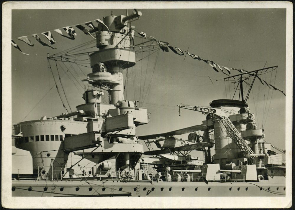 3061 | 12 € | DEUTSCHE KRIEGSMARINE 1933-1939 : DEUTSCHES REICH 1935 (ca.) s/w.-Foto-Ak.: Panzerschiff "Deutschland", Mittelschiff mit Gefechtsmast u. Bordflugzeug Heinkel He 60 (?), ungebr. (Verlag H. Andres, Hambg.1) | ![]() | |