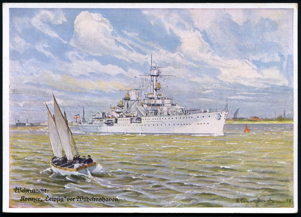 3065 | 12 € | DEUTSCHE KRIEGSMARINE 1933-1939 : DEUTSCHES REICH 1936 Color-Künstler-Ak.: Kreuzer "Leipzig" vor Wilhelmshaven , sign. W. Zeeden ´35, ungebr. (Verlag Andelfinger, München) | ![]() | |