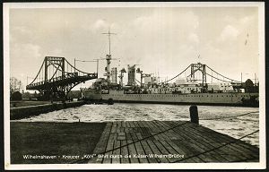 3056 | 12 € | DEUTSCHE KRIEGSMARINE 1933-1939 : Wilhelmshaven 1935 (ca.) s/w.-Foto-Ak.: Kreuzer "Köln" fährt durch die Kaiser-Wilhelm-Brücke (Schwenk-Brücke), ungebr. (Uhv. Nordseeverlag, W´haven) | ![]() | |