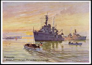 3068 | 12 € | DEUTSCHE KRIEGSMARINE 1933-1939 : DEUTSCHES REICH 1936 (ca.) Color-Künstler-Ak.: Kreuzer "Karlsruhe" u. "Köln" vor Helgoland , sign. W. Zeeden, ungebr. (Verlag Andelfinger, München) | ![]() | |
