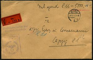 3053 | 45 € | DEUTSCHE KRIEGSMARINE 1933-1939 : KIEL/ *1v 1939 (28.8.) 1K-Brücke + viol. Ra.: Frei durch/Ablösung/Reich/ Marineintendentatur Kiel Marinestandortkasse + viol. 2L , orange VZ: Kiel 1/b, rs. 2 rote Marine-Lacksiegel, sauber gest., seltener Inl.-Wert-Bf. 5000.- RM (drei Tage vor Beginn des II. Weltkrieges!) | ![]() ![]() | |