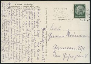 3067 | 10 € | DEUTSCHE KRIEGSMARINE 1933-1939 : DEUTSCHES REICH 1938 (24.1.) s/w.-Foto-Ak. (Leichter) Kreuzer "Nürnberg" vor Anker , gest. Hamburg 1, Bedarf (Uhv. Nr.K 280, Verla H.Andres, Hambg.) | ![]() ![]() | |