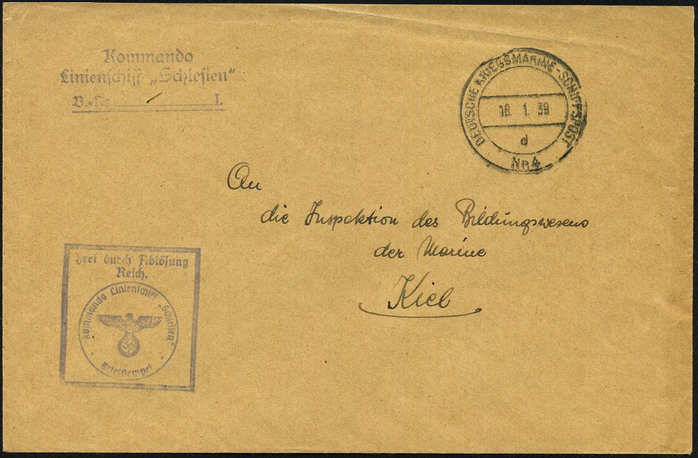 3091 | 35 € | DEUTSCHE MARINE-SCHIFFSPOST 1933-1939 : DEUTSCHES REICH / CUBA 1939 (18.1.) 2K-Bord-PA: DEUTSCHE KRIEGSMARINE-SCHIFFSPOST/d/Nr.4 = Linienschiff "Schlesien" + viol. 3L: Kommando/Linienschiff "Schlesien".., letzte Auslandsreise Süd- & Mittelamerika, Etappe Cuba + viol. Ra.: Frei durch Ablösung/Reich./..Linienschiff "Schlesien", klar gest. Dienst-Bf. n. Kiel | ![]() | |