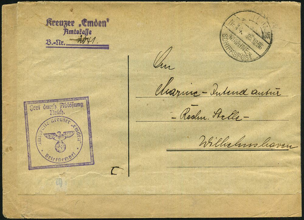 3084 | 30 € | DEUTSCHE MARINE-SCHIFFSPOST 1933-1939 : DEUTSCHES REICH 1936 (23.12.) aptiertes 1K-Brücken-Bord-PA.: DEUTSCHE/MARINE-/SCHIFFSPOST/Nr.14 = "KAIS." entfernt = Kleiner Kreuzer "Emden" (III) + viol. Ra.: FdA/Reich/Amtskasse Kreuzer "Emden" + viol. 3L: Kreuzer "Emden"... = Mittelmeer, Schwarzmeer & Ostasien-Reise, Recycling-Dienst-Bf. n. Wilhelmshaven | ![]() | |