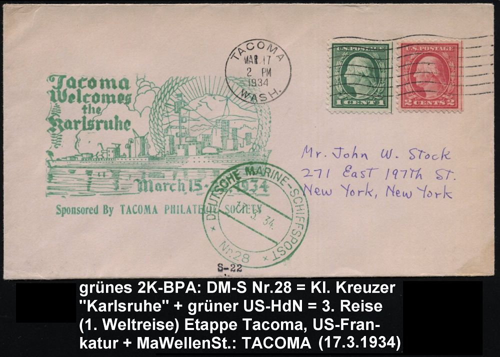 3095 | 40 € | DEUTSCHE MARINE-SCHIFFSPOST 1933-1939 : U.S.A. / DEUTSCHES REICH 1934 (17.5.) 2K-Bord-PA: DEUTSCHE MARINE-SCHIFFSPOST/Nr.28 in g r ü n = Leichter Kreuzer "Karlsruhe", 3. Auslands- u. 1. Weltreise, Etappe Tacoma, Wash., U.S.A. + grüner HdN: Tacoma Welcomes the Karlsruhe.. , US.-Frankatur 1 u. 2 C. Washington, MaWellenSt.: TACOMA/WASH., klar gest. Inl.-Bf. n. New York, seltene Stempelfarbe! | ![]() | |