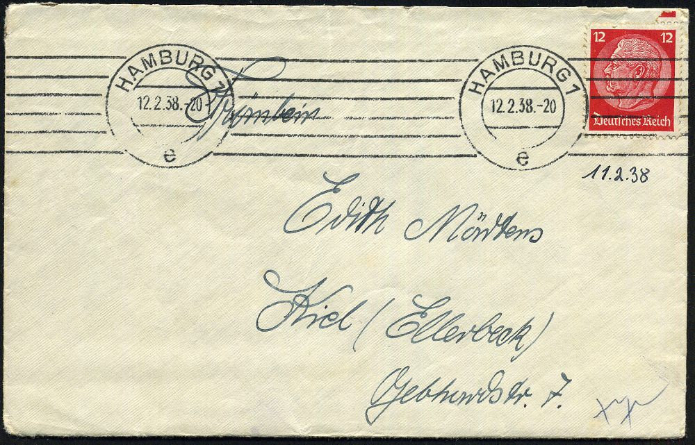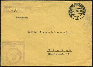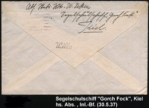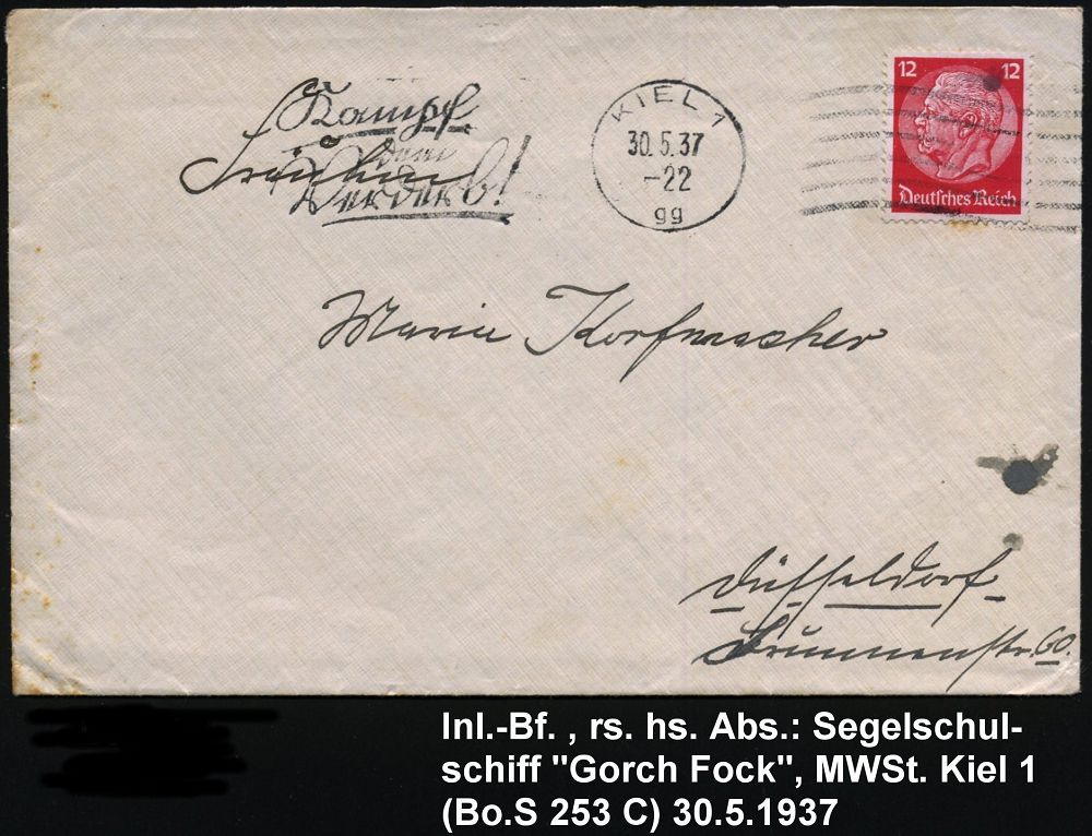 3078 | 25 € | DEUTSCHE MARINE-SCHIFFSPOST 1933-1939 : Kiel 1 1937 (30.5.) MaWSt.: KIEL 1/gg/KAMPF/dem/Verderb! + 6 Wellen rechts (in Sütterlin, Bo.S 253 C) rs. hs. Abs.: "..Segel-schulschiff "Gorch Fock", Kiel", frankierter Fernbf. (Mi.519) | ![]() ![]() | |