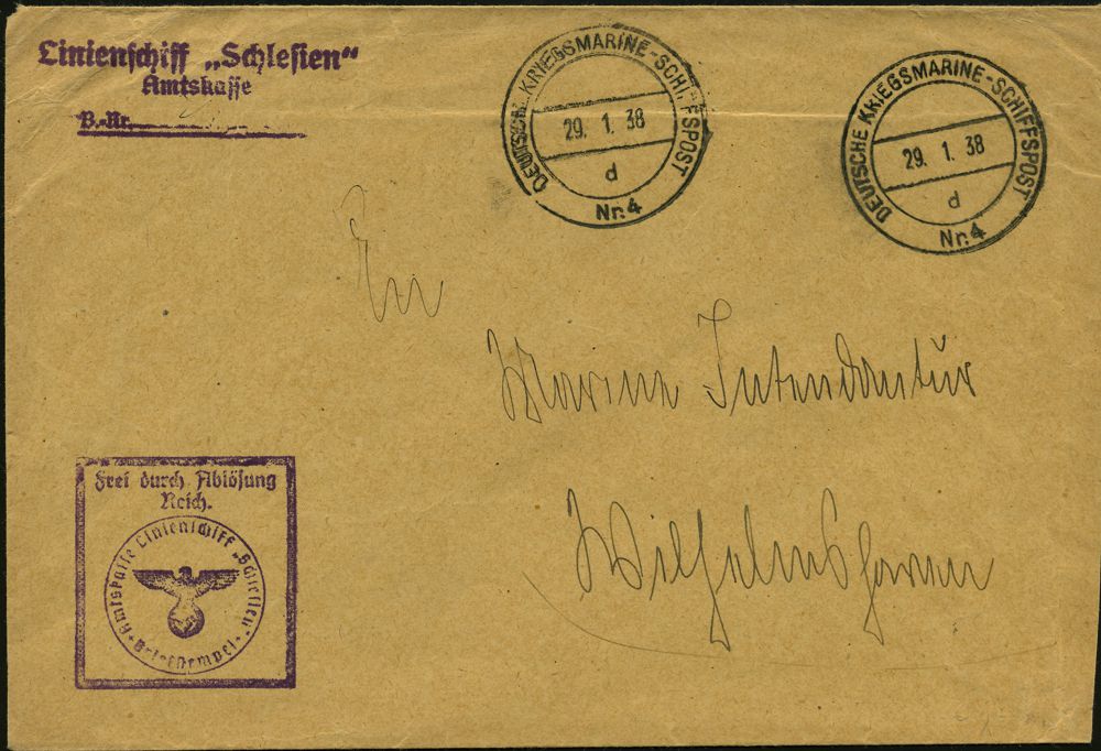 3092 | 25 € | DEUTSCHE MARINE-SCHIFFSPOST 1933-1939 : DEUTSCHES REICH 1938 (29.1.) 2K-Bord-PA.: DEUTSCHE KRIEGSMARINE-SCHIFFSPOST/d/Nr.4 + viol. 3L: Linienschiff "Schlesien".. + viol. Ra.: FdA/R/ Amtskasse Linienschiff "Schlesien", 2x klar gest. Dienstbf. n. Wilhelmshaven (Kat.Nr.X) | ![]() | |