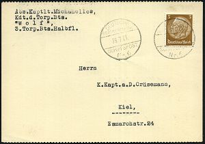 3081 | 25 € | DEUTSCHE MARINE-SCHIFFSPOST 1933-1939 : DEUTSCHES REICH / FINNLAND 1933 (29.7.) 1K-Bord-PA (Brücke): DEUTSCHE/REICHSMARINE/SCHIFFSPOST/Nr.6 = 3. Torpedoboot-Halbflottille, Ostsee-Reise, Etappe Helsinki + maschinengeschr. Abs.: "Kaptlt. Michealles, Kdt. d. Torp. Bts. "Wolf"..", Drs.-Karte n. Kiel (Mi.482) | ![]() | |
