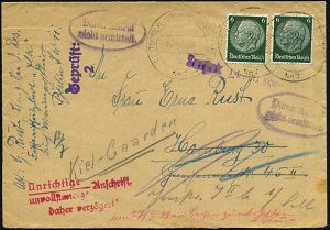 3094 | 35 € | DEUTSCHE MARINE-SCHIFFSPOST 1933-1939 : DEUTSCHES REICH 1937 (Juli) 2K-BordPA.: DEUTSCHE KRIEGSMARINE-SCHIFFSPOST/g/Nr.7 (teils undeutl.) = Fischerei-Schutzboot "Elbe" 3x + hs. Abs.: ".. Fischereischutzboot "Elbe" durch Marinepostbüro Berlin SW 11" + div. postamtl. Verzögerungs- u. Hinweis-HdN + 1L: Zurück (Bf. rs. Klappenfehler) mehrfach nachgsandter Retour-Bf.!, seltener Beleg! (Mi.516 MeF) | ![]() | |