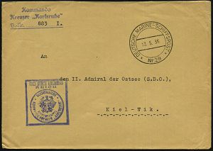 3086 | 45 € | DEUTSCHE MARINE-SCHIFFSPOST 1933-1939 : DEUTSCHES REICH 1937 (17.1.) 2K-Bord-PA: DEUTSCHE KRIEGSMARINE/Nr. 31 + viol. 3L: Amtskasse/Segelschulschiff "Horst Wessel".. + Ra.: FdAR/..Kommando Segelschulschiff "Horst Wessel" (mittig etw. undeutl., rechts Riß) sehr seltener Marine-Dienstbf. n. Kiel | ![]() ![]() | |