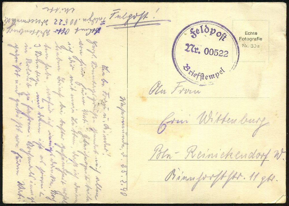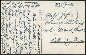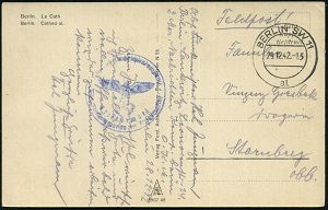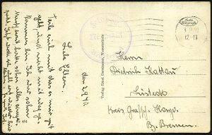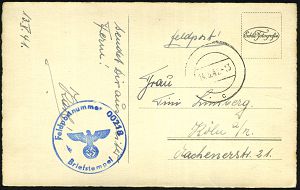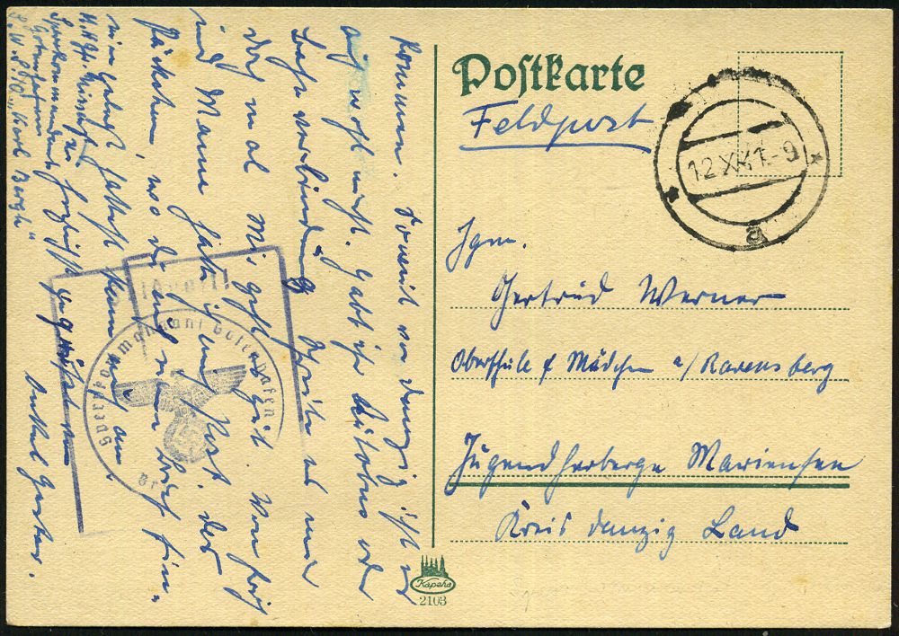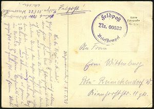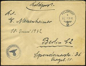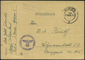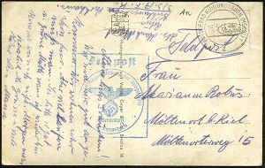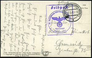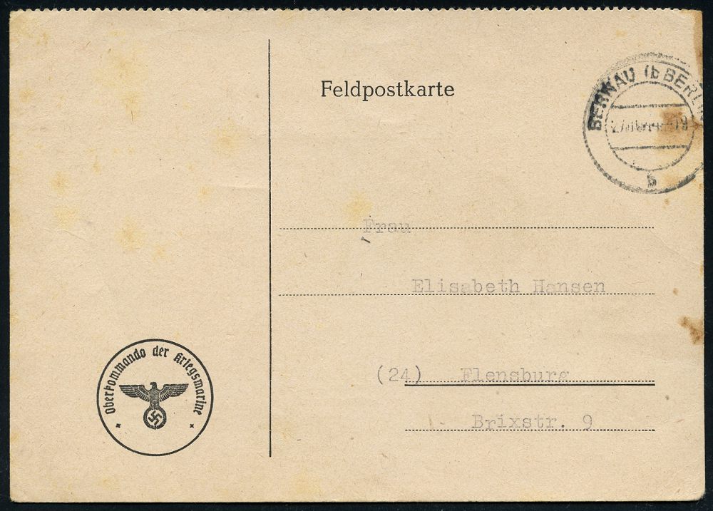 3100 | 10 € | DEUTSCHE KRIEGSMARINE & MARINE-FELDPOST II. WELTKRIEG : BERLIN SW 11/ al 1942 (29.12.) MaSt ohne Text + blauer 1K-HdN: Marine-Nachrichtenstabskompanie/bei Oberkommando der Kriegsmarine + hs. Abs.: ".. Berlin-Lankwitz, 2. Mar. Nachrichten Komp. beim O.K.M.", s/w.-Feldpost-Ak. (Dom) n. Starnberg | ![]() | |