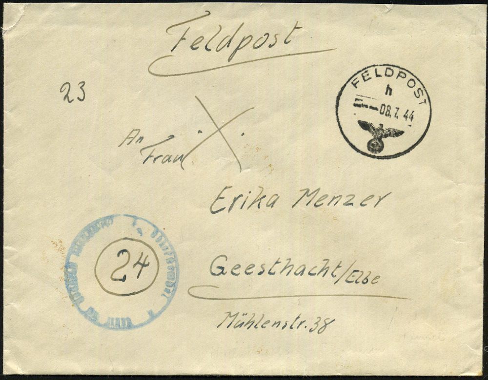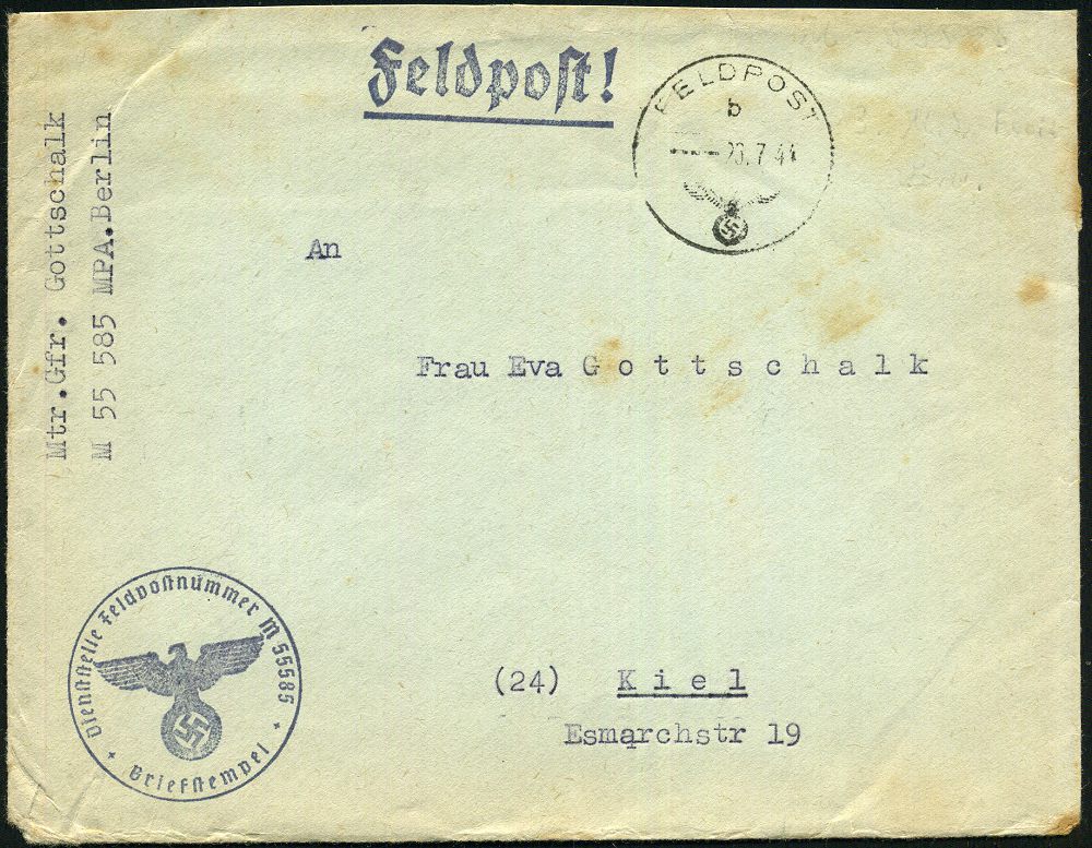 3108 | 10 € | DEUTSCHE KRIEGSMARINE & MARINE-FELDPOST II. WELTKRIEG : Gotenhafen 1944 (26.7.) 1K: FELDPOST/b/--- + blauer 1K-HdN: Feldpostnr. M 55585 = 3. Minensuch-Flotten-Verwaltung Gotenhafen (M.P.A. Berlin) klar gest. Feldpost-Bf. (etw. fleckig) + Inhalt n. Kiel, 2 Belege kompl. | ![]() | |
