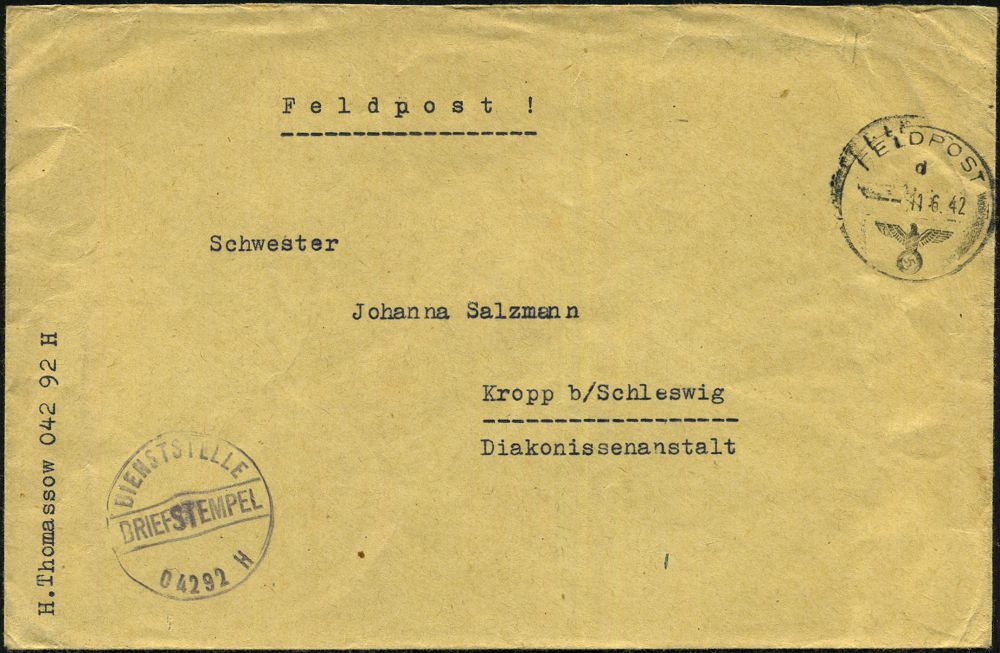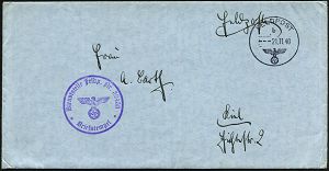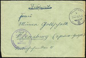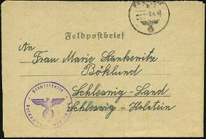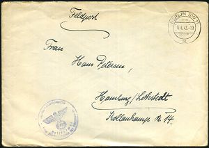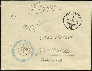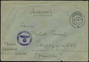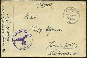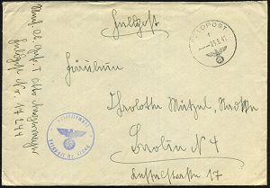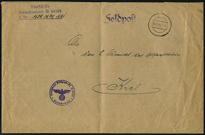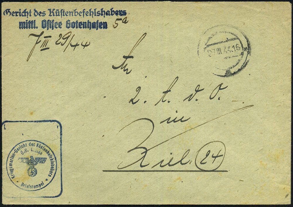 3110 | 16 € | DEUTSCHE KRIEGSMARINE & MARINE-FELDPOST II. WELTKRIEG : Gotenhafen 1944 (27.III.) aptierter, stummer, ehem. polnischer 2K-Steg = Tarnstempel Gotenhafen + blauer Ra.: Kriegsmarine-Gericht des Küstenbefehlshaber/Östl. Otsee + blauer 2L.: Gericht des Küstenbefehlshaber, mittlere Ostsee Gotenhafen, klar gest. Feldpost-Bf. n. Kiel = eigene Gerichtsbarkeit der Marine, Kriegsgerichte! | ![]() | |