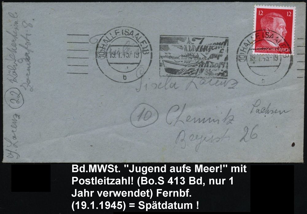 3111 | 16 € | DEUTSCHE KRIEGSMARINE & MARINE-FELDPOST II. WELTKRIEG : (10) HALLE (SAALE) 8/ b/ Jugend/ aufs/ Meer! 1945 (19.1.) Band-MWSt + 6 waager. Striche + PLGZ = Schnellboot , klar gest., später Fernbf. n. Chemnitz (Bo.S 413 Bd , unbekanntes Spätdatum!) | ![]() | |