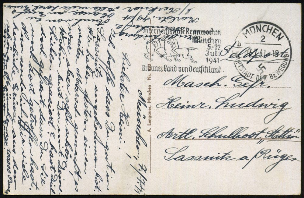3120 | 20 € | DEUTSCHE KRIEGSMARINE & MARINE-FELDPOST II. WELTKRIEG : München / Sassnitz 1941/42 3 Feldpost-Ak. (2x Ansichten München, 1x Glückwunsch) an Artillerie-Schulboot "Stettin" in Sassnitz, 1x MWSt.: MÜNCHEN 2/b/ Internat. Rennwochen../Braunes Band (Bo.S 378 A etc.) u. Kiel (1x) , 3 klar gest. Feldpost-Belege | ![]() ![]() ![]() ![]() ![]() | |