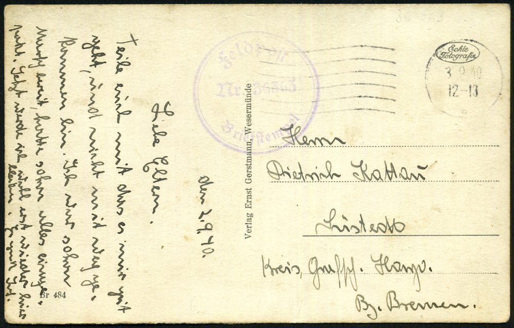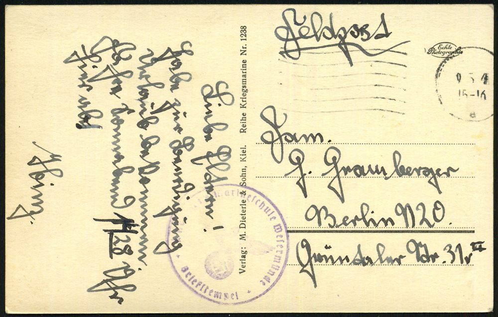3106 | 12 € | DEUTSCHE KRIEGSMARINE & MARINE-FELDPOST II. WELTKRIEG : Wesermünde 1940 (9.5.) stummer MaWellenSt = Tarnstempel Wesermünde (= Bremerhaven) + viol. 1K-HdN: ..Marineschule Wesermünde (links oben etw. undeutl.) s/w.-Feldpost-Foto-Ak.: Zerstörer "Friedrich Eckoldt" (Z 16) n. Berlin, am 31.12.1942 von brit. Kreuzer "Sheffield" im Nordmeer versenkt | ![]() ![]() | |