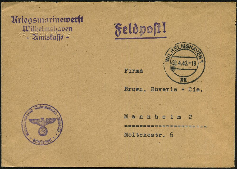 3128 | 15 € | DEUTSCHE KRIEGSMARINE & MARINE-FELDPOST II. WELTKRIEG : WILHELMSHAVEN1/ xx 1942 (20.4.) 2K -Steg+ viol. 1K-HdN: Kriegsmarinewerft Wilhelmshaven Amtskasse + entspr. viol. Abs.-3L + Blinddruck: KRIEGSMARINE, Feldpost-Bf. n. Mannheim | ![]() | |