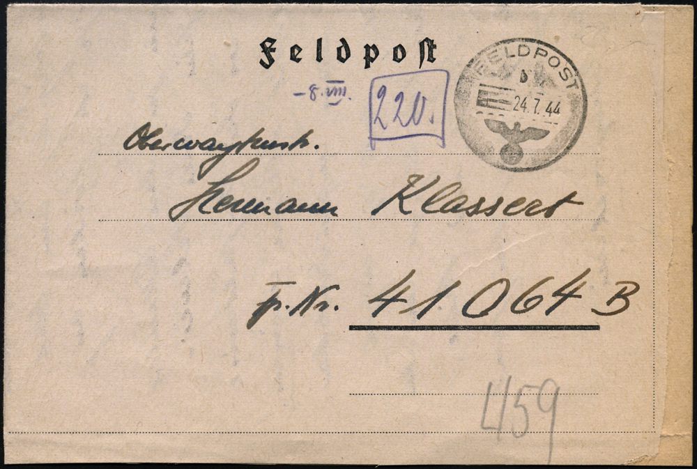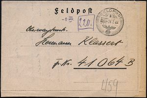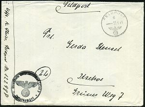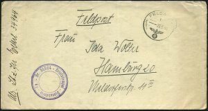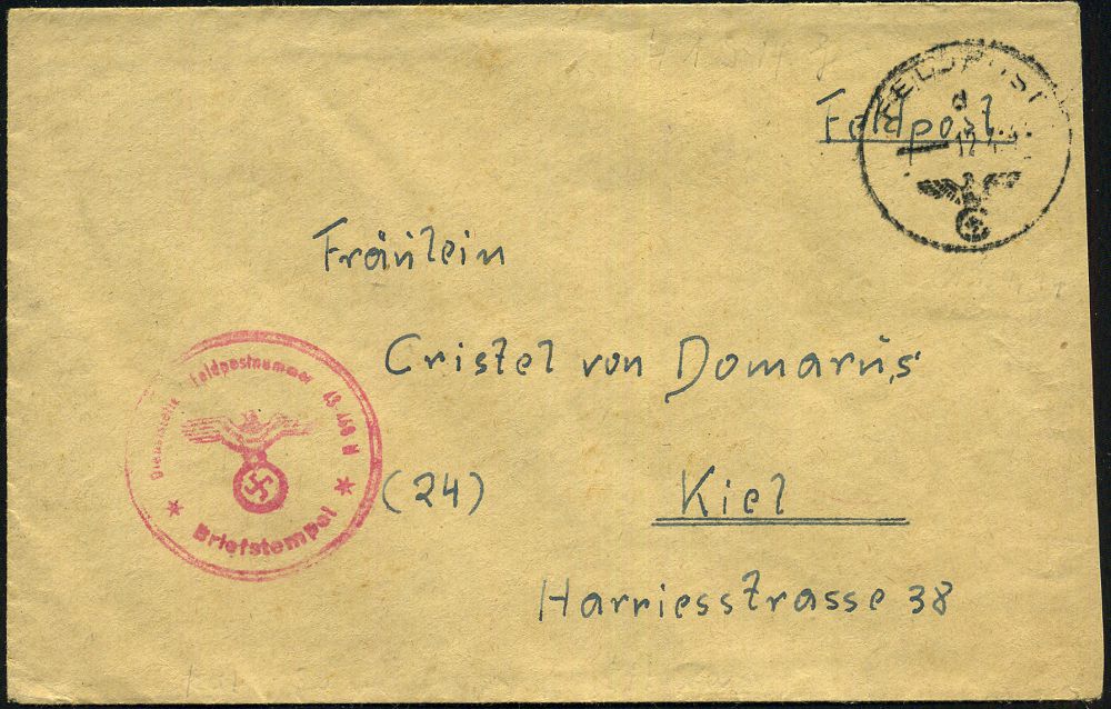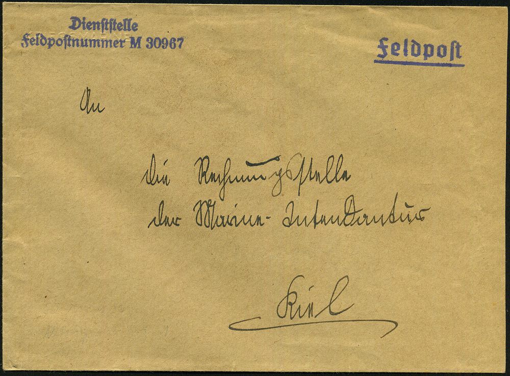 3149 | 12 € | DEUTSCHE KRIEGSMARINE & MARINE-FELDPOST II. WELTKRIEG : DEUTSCHES REICH 1943 (23.5.) 1K: FELDPOST/a/--- (oben etw. undeutl.) + viol. Ra.: Frei durch Ablösung/Reich/ Feldpostnr. 20759 + viol. Abs.-3L. = Befehlshaber Sicherung Ostsee , Marine-Dienstbf. an Ober-Kdo. Marine, Berlin | ![]() | |