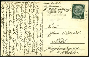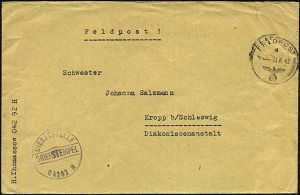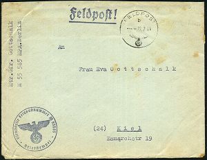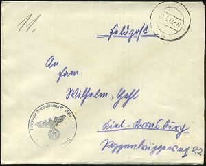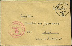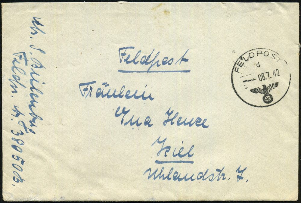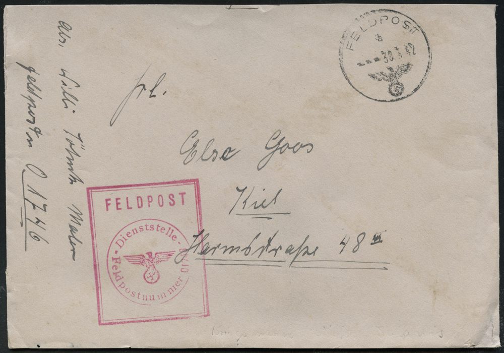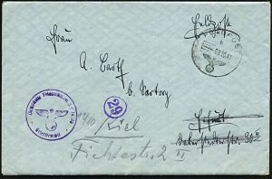 3117 | 20 € | DEUTSCHE KRIEGSMARINE & MARINE-FELDPOST II. WELTKRIEG : Kiel 1942 (4.4.) stummer 2K-Steg = Tarnstempel Kiel + viol. 1K-HdN: Kommando 1. Abteilung Marineschule Kiel + hs. Abs., rs. seltene Verschluß-Vignette: Marineschule Kiel (Eule auf Zahrad) klar gest. Feldpost-Bf. + Inhalt n. Essen | ![]() ![]() | |