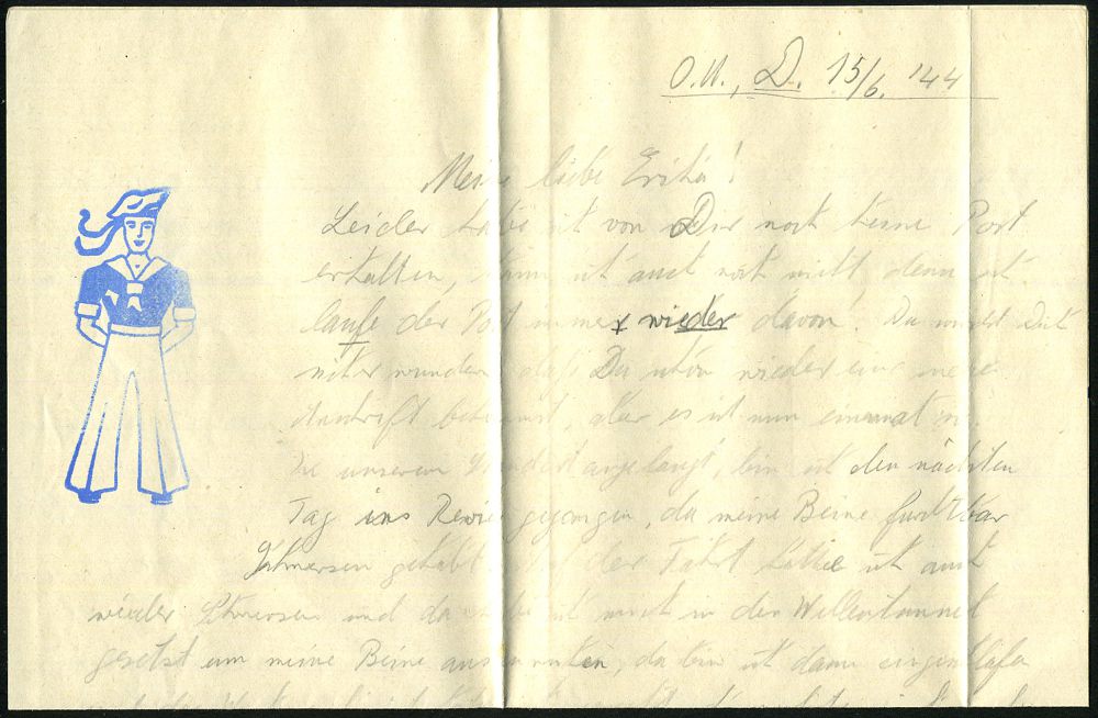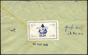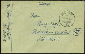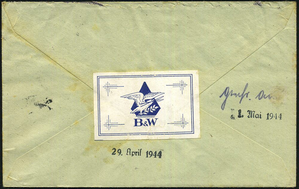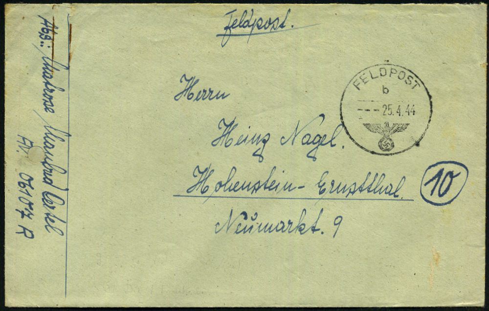 3161 | 12 € | DEUTSCHE KRIEGSMARINE & MARINE-FELDPOST II. WELTKRIEG : DT.BES.FRANKREICH 1944 (25.4.) 1K: FELDPOST/b/-- + hs. vs. Abs.: "06107 R" = 9./ Schiffs-Stammabtlg., S t . D i e + rs. blaue Adler-Vignette "B & W" (Bf. (1x Reg.-Loch geschl.) Feldpost-Bf. + Inhalt n. Hohenstein-Ernstthal | ![]() ![]() | |