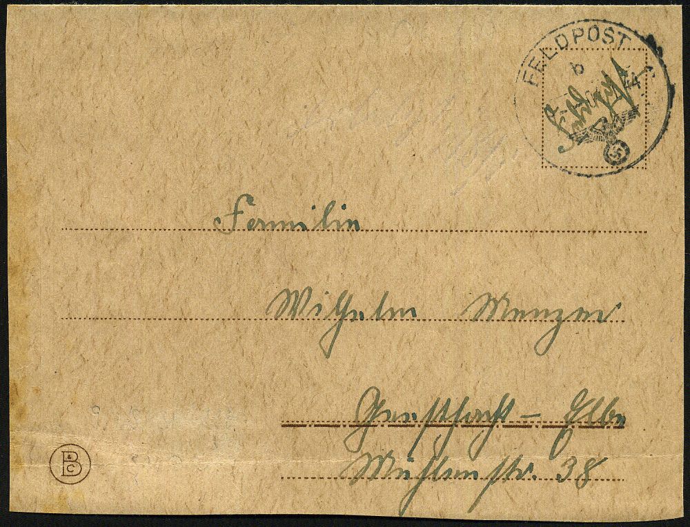 3155 | 14 € | DEUTSCHE KRIEGSMARINE & MARINE-FELDPOST II. WELTKRIEG : DT.BES.FRANKREICH 1940 (19.12.) 1K: FELDPOST/b/--- + total aptierter Ra.: Feldpost.. , Fp.-Nr. entfernt + hs. Abs.: "No. 03948" = 3./ Marine-Artillerie-Abtlg. 262, B r e s t , klar gest. Feldpost-Bf. (links Eckfehler) n. Kiel | ![]() | |