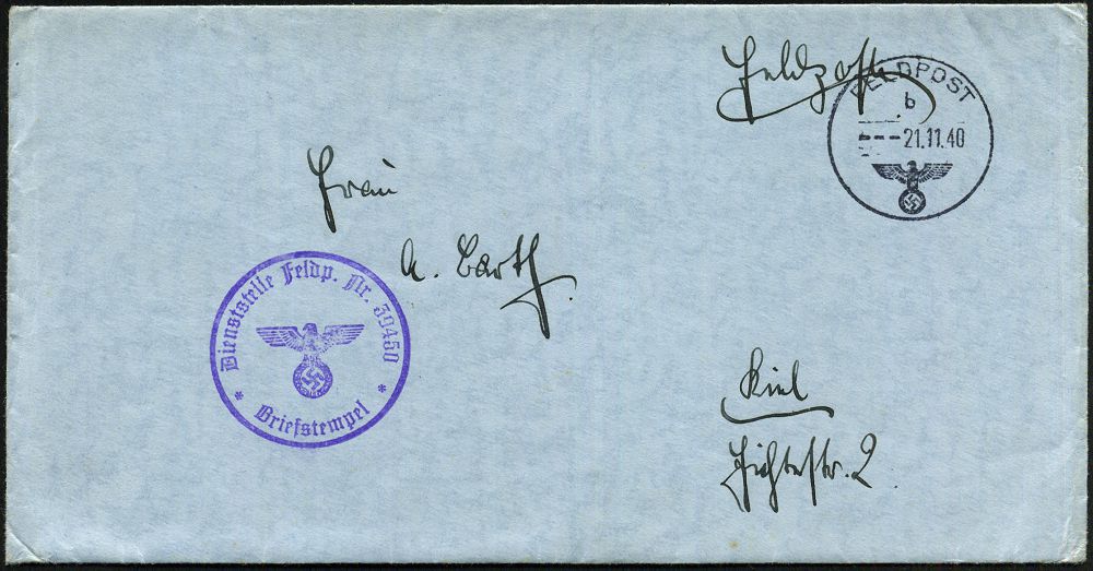 3171 | 15 € | DEUTSCHE KRIEGSMARINE & MARINE-FELDPOST II. WELTKRIEG : DT.BES.NORWEGEN 1940 (21.11.) 1K: FELDPOST/b/--- + viol. 1K-HdN: Dienststelle Feldp. Nr. 39450 = Kommandantur der See-Verteidigung O s l o + rs. hs. Abs., klar gest. Feldpost-Bf. + Inhalt n. Kiel | ![]() | |