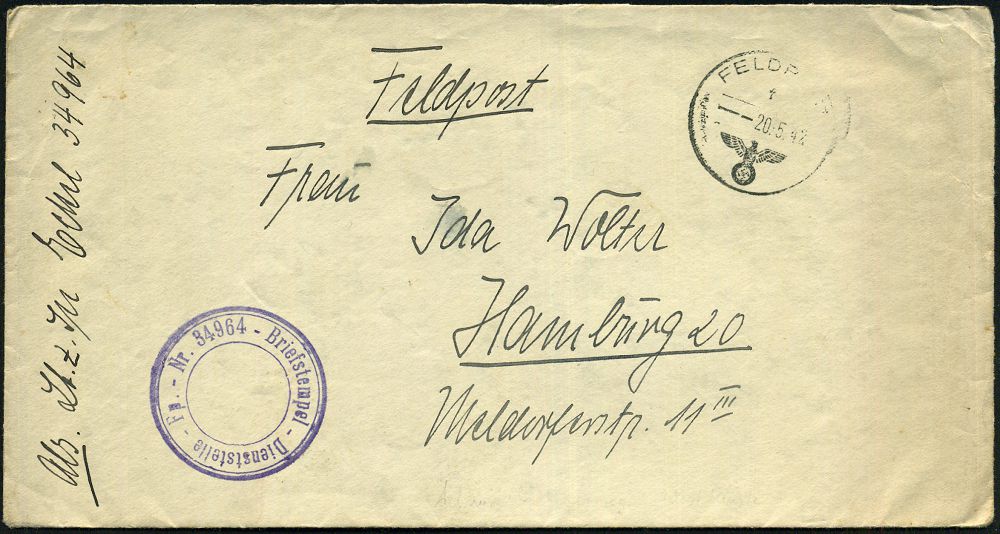 3174 | 15 € | DEUTSCHE KRIEGSMARINE & MARINE-FELDPOST II. WELTKRIEG : DT.BES.NORWEGEN 1942 (20.5.) 1K: FELDPOST/f/--- + viol. 3K-HdN: Dienststelle - Fp.-Nr. 34964.. = Admiral norwegische Westküste + vs. hs. Abs., Feldpost-Bf. + Inhalt n. Hambg. | ![]() | |