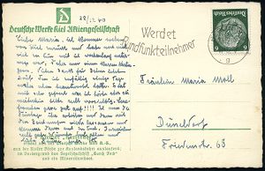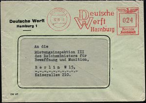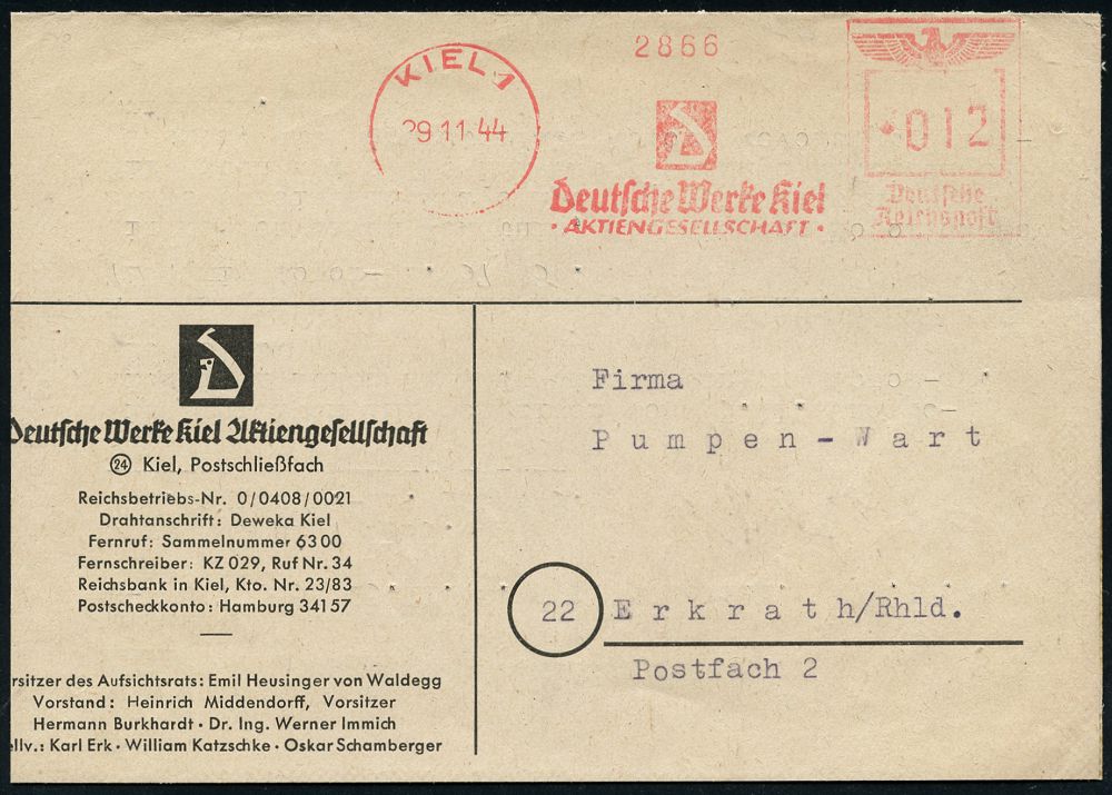 3118 | 35 € | DEUTSCHE KRIEGSMARINE & MARINE-FELDPOST II. WELTKRIEG : KIEL 1/ D/ Deutsche Werke Kiel/ AG. 1944 (29.11.) später AFS Francotyp "Reichsadler" (Monogr.-Logo "D") auf motivgl. Firmen-Faltbrief mit Inhalt = Werft bedeutender Kriegsschiffe Schlachtschiff "Gneisenau", Flugzeugträger "Graf Zeppelin"(Bau abgebrochen) u.v.a, + 2 Faksimile-Bilder (Dü.E-5DGh) | ![]() ![]() ![]() | |