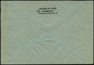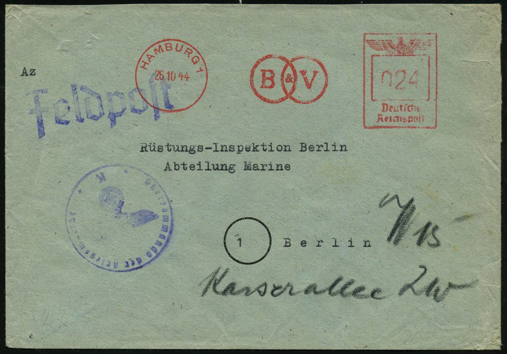 3114 | 35 € | DEUTSCHE KRIEGSMARINE & MARINE-FELDPOST II. WELTKRIEG : HAMBURG 1/ B & V 1944 (26.10.) später AFS Francotyp "Reichsadler" = B(lohm) & V(oss), Kriegswerft, Herstellung von U-Booten, Schlachtschiff "Bismarck", Kreuzer "Hipper", Segelschulschiffe Gorch-Fock-Klasse , Fahrgastschiiff "Wilh. Gustloff" etc. + viol. 1K-HdN: Oberkommando der Kriegsmarine/K + 1L: Feldpost, frankierter Feldpost-Bf. (rechts Riß) rs. Abs.-Vordruck, seltener Beleg! vergl. Los Nr.3051, 3071, 3078, 3098-99 u.a. (Dü.E-5BGo) | ![]() ![]() | |