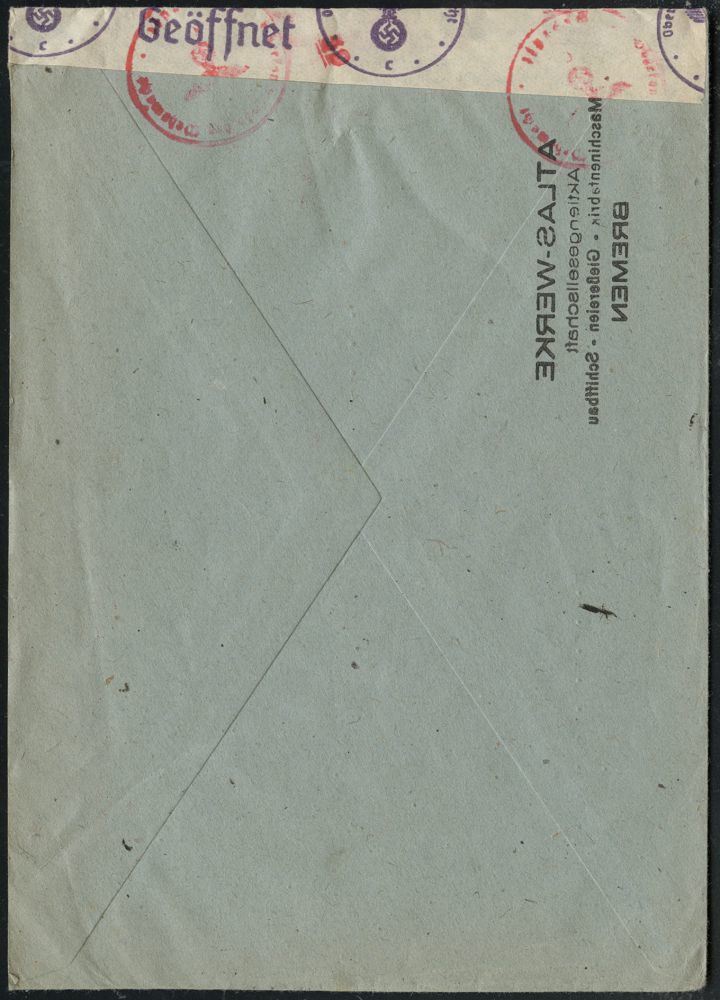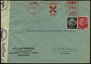 3105 | 35 € | DEUTSCHE KRIEGSMARINE & MARINE-FELDPOST II. WELTKRIEG : BREMEN/ 1/ ATLAS/ WERKE 1941 (11.2.) AFS Francotyp "Reichsadler" 012 Pf. (Logo: Schifssschraube) + Zusatzfrankatur 1 Pf. u. 12 Pf. Hindenbg. (Mi.512, 519) Firmen-Bf.: ATLAS-WERKE AG.. Schiffbau + OKW-Zensur-1K + Streifen "Geöffnet/c" = Köln (Rie.C-4, C-55) Ausl.-Zensur-Bf. n. Holland, im I.Wk. U-Boot-, im II. Wk. Minensuchern-Bau etc. (Dü.E-5BAo) | ![]() ![]() | |
