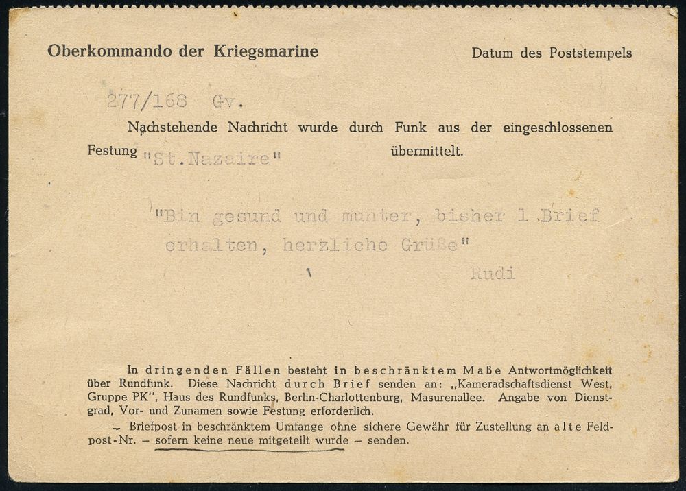 3104 | 120 € | DEUTSCHE KRIEGSMARINE & MARINE-FELDPOST II. WELTKRIEG : BERNAU (b BERLIN)/ b 1944 (27.10.) 2K-Steg auf Feldpost-Dienst-Kt.: Oberkommando der Kriegsmarine "Funk-Nachricht Festung St. Nazaire" = U-Boot- u. Marine-Stützpunkt (kl. Randfleckchen) mit Schreibmaschinen-Text (über LGPA u. Marinepostamt Wiesbaden) n. Flensburg, (kl. Fleckchen) sonst gute Erhaltung!, selten! (Mi.1 + 350.- EUR, 2009) | ![]() ![]() | |