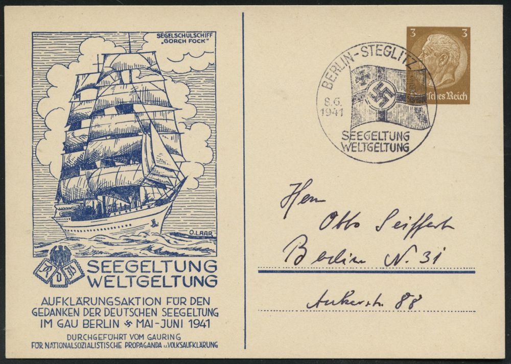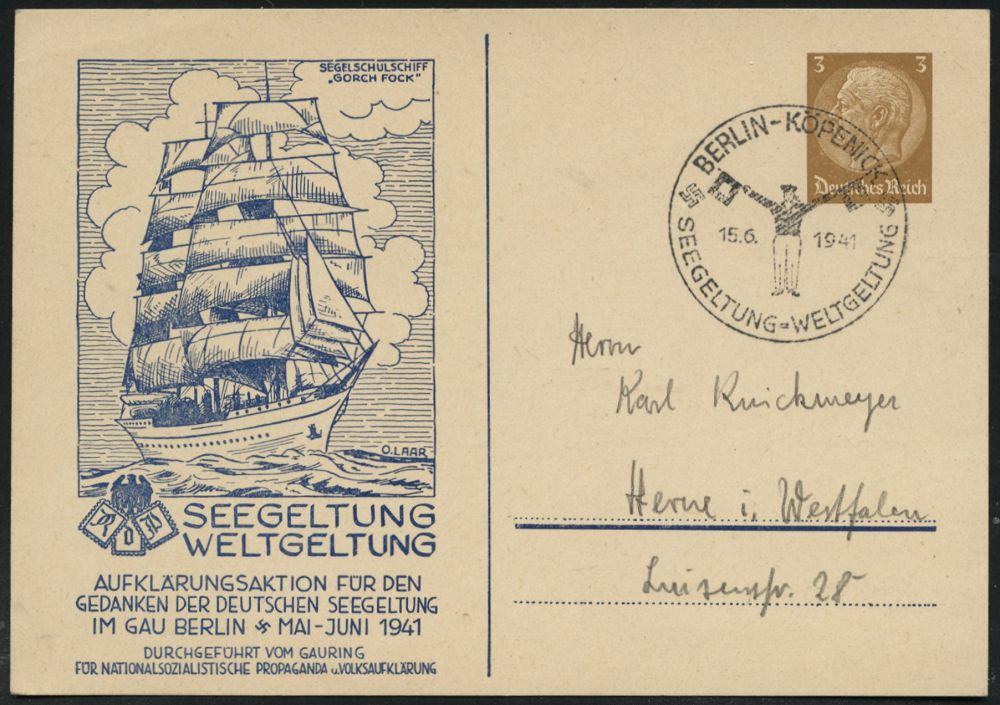 3098 | 18 € | DEUTSCHE KRIEGSMARINE & MARINE-FELDPOST II. WELTKRIEG : BERLIN-STEGLITZ/ SEEGELTUNG/ WELTGELTUNG 1941 (8.6.) SSt = Seekriegsflagge auf passender PP 3 Pf. Hindenbg.: SEGELSCHUL-SCHIFF "GORCH FOCK".. (Mi.PP 122/C 113) klar gest. Inl.-Karte, vergl. Los Nr.3051, 3071, 3078, 3099, 3012 (Bo.363) | ![]() | |