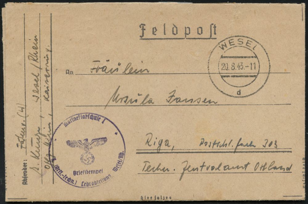 3125 | 12 € | DEUTSCHE KRIEGSMARINE & MARINE-FELDPOST II. WELTKRIEG : WESEL/ d 1943 (20.8.) 2K-Steg + viol. 1K-HdN: Marineflakschule I / 6 (Artl.-techn.) Lehrabteilung Wesel/Rh. + hs. Abs., klar gest. Feldpost-Falt-Bf. mit Inhalt (innen etw. gestützt) nach Riga ohne Zensur | ![]() | |