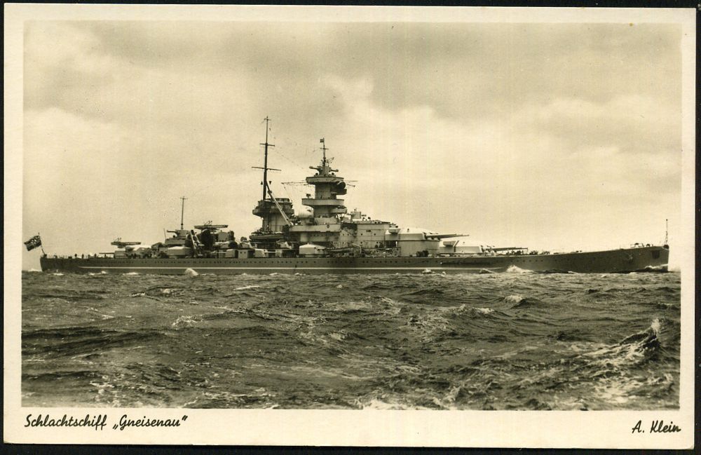 3130 | 10 € | DEUTSCHE KRIEGSMARINE & MARINE-FELDPOST II. WELTKRIEG : DEUTSCHES REICH 1939 (ca.) s/w.-Foto-Ak.: Schlachtschiff "Gneisenau" , ungebr. (Verlag u. Fotograf: A. Klein, Kiel) | ![]() | |